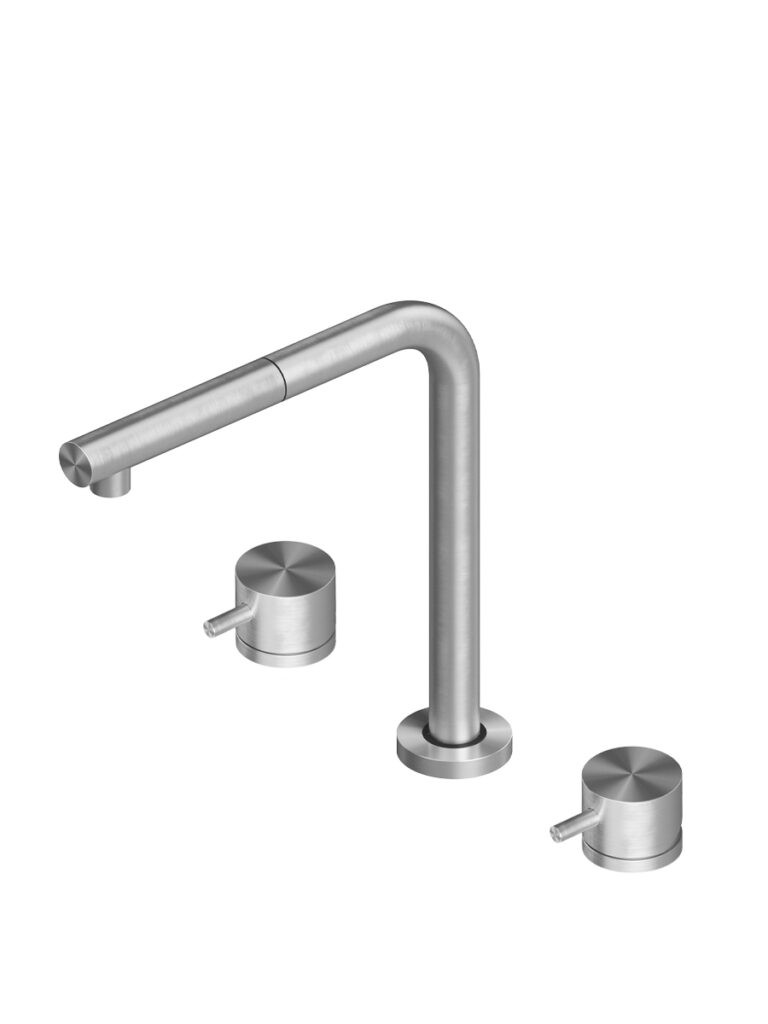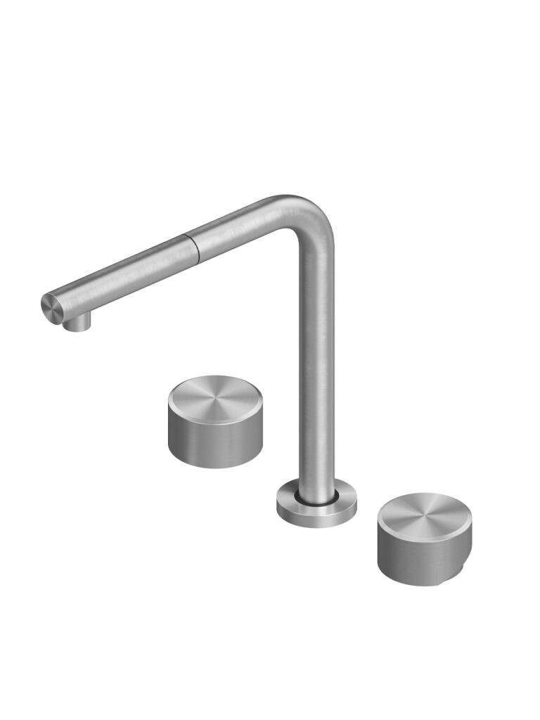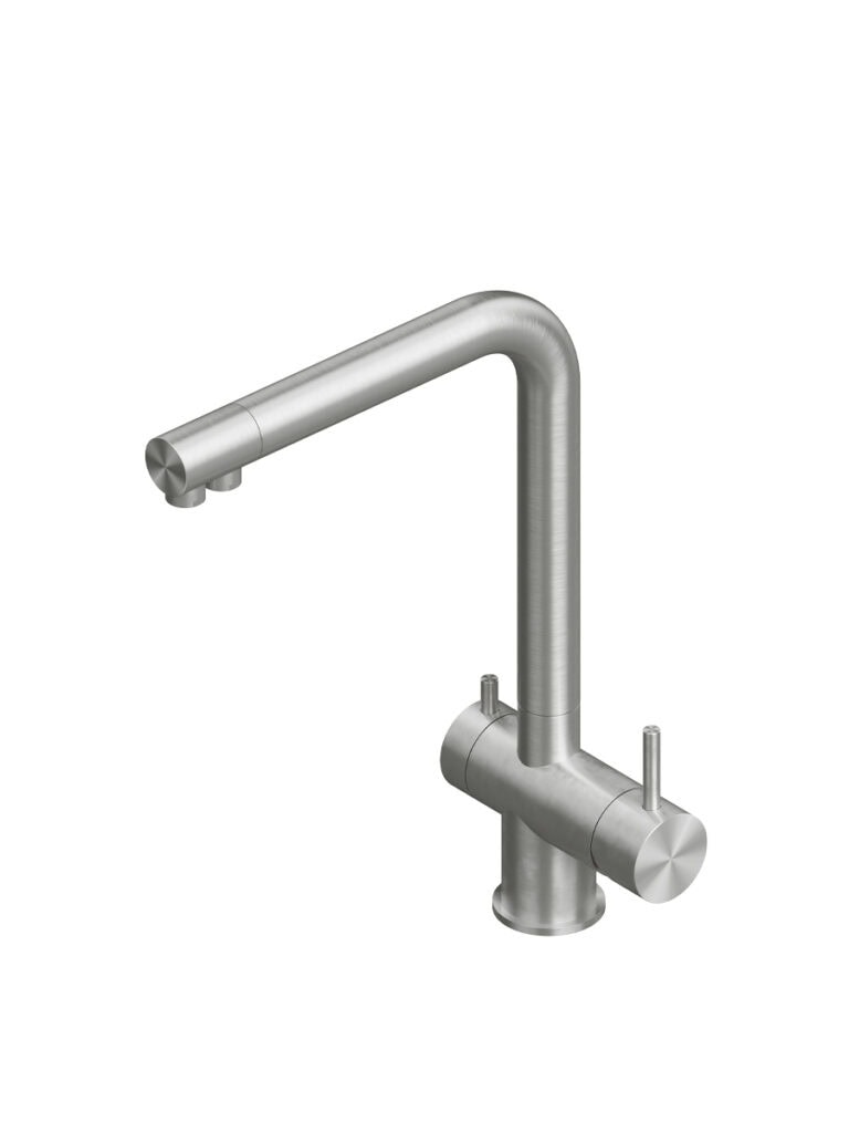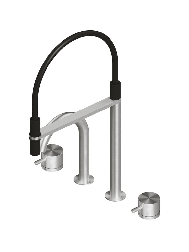 AISI316L stainless steel deck mounted mixer set three ways with swivelling and extractable spout, with remote control for water treatment and dedicated swivelling spout for filtered water.