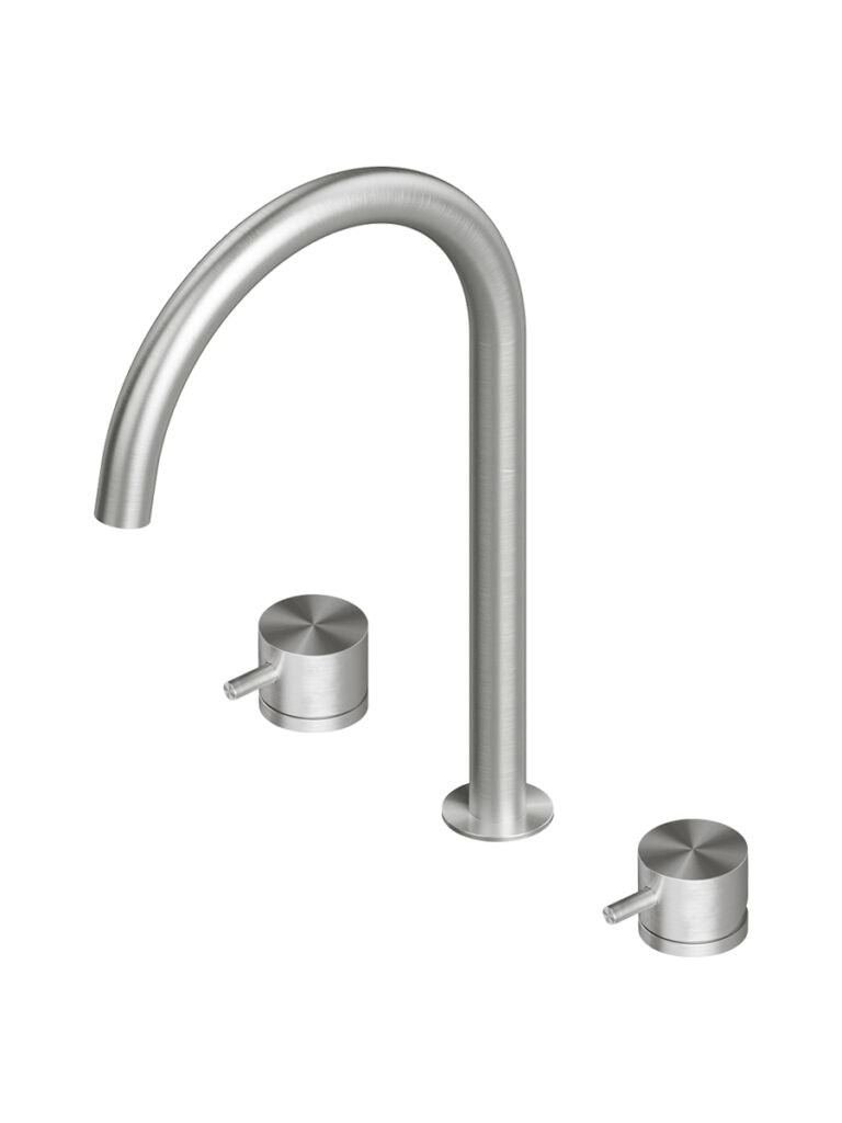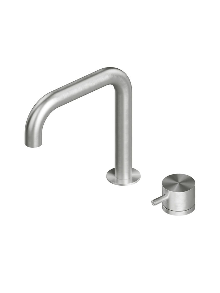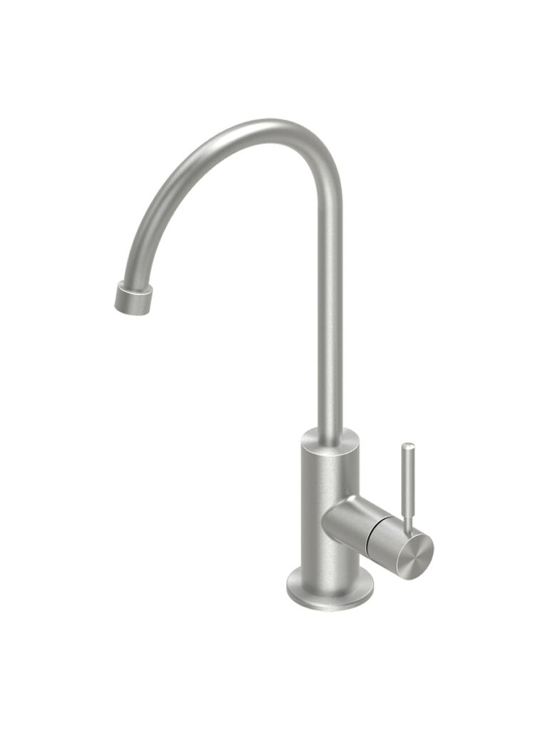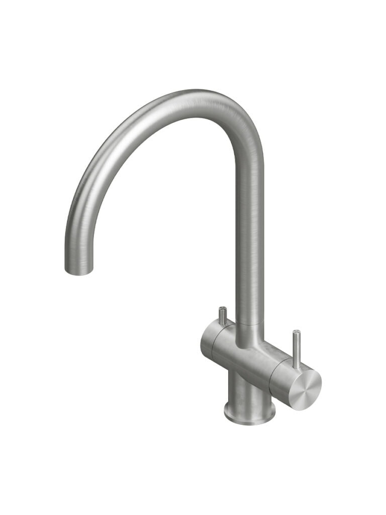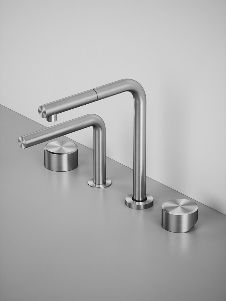 AISI316L stainless steel deck mounted mixer set three ways with swivelling and extractable spout, with remote control for water treatment and dedicated swivelling spout for filtered water.