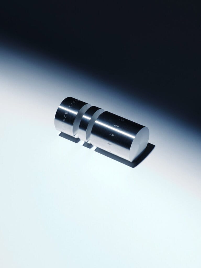 “I Giorni” perpetual calendar, made in AISI316L stainless steel and oak wood base. Code DAT01.