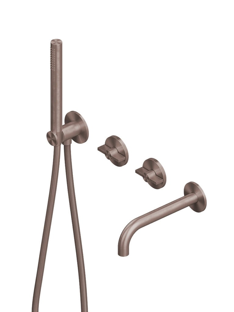 Wall mounted 2 hydroprogressive mixers set with hand shower and spout.