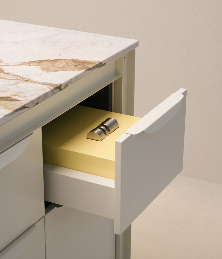 Gioiello comprende otto oggetti per la mise-en-place, nati da una ricerca sul linguaggio grafico bidimensionale dei merletti e dei ricami decorativi presenti sulle tovaglie della prima metà del Novecento. Questi pattern ornamentali guidano il taglio laser delle lastre d’acciaio, dando forma a vassoi multiuso, alzate, cestini per la frutta e a un coltello da burro. Pensati per la condivisione, gli oggetti favoriscono gesti collettivi e momenti di scambio attorno alla tavola.