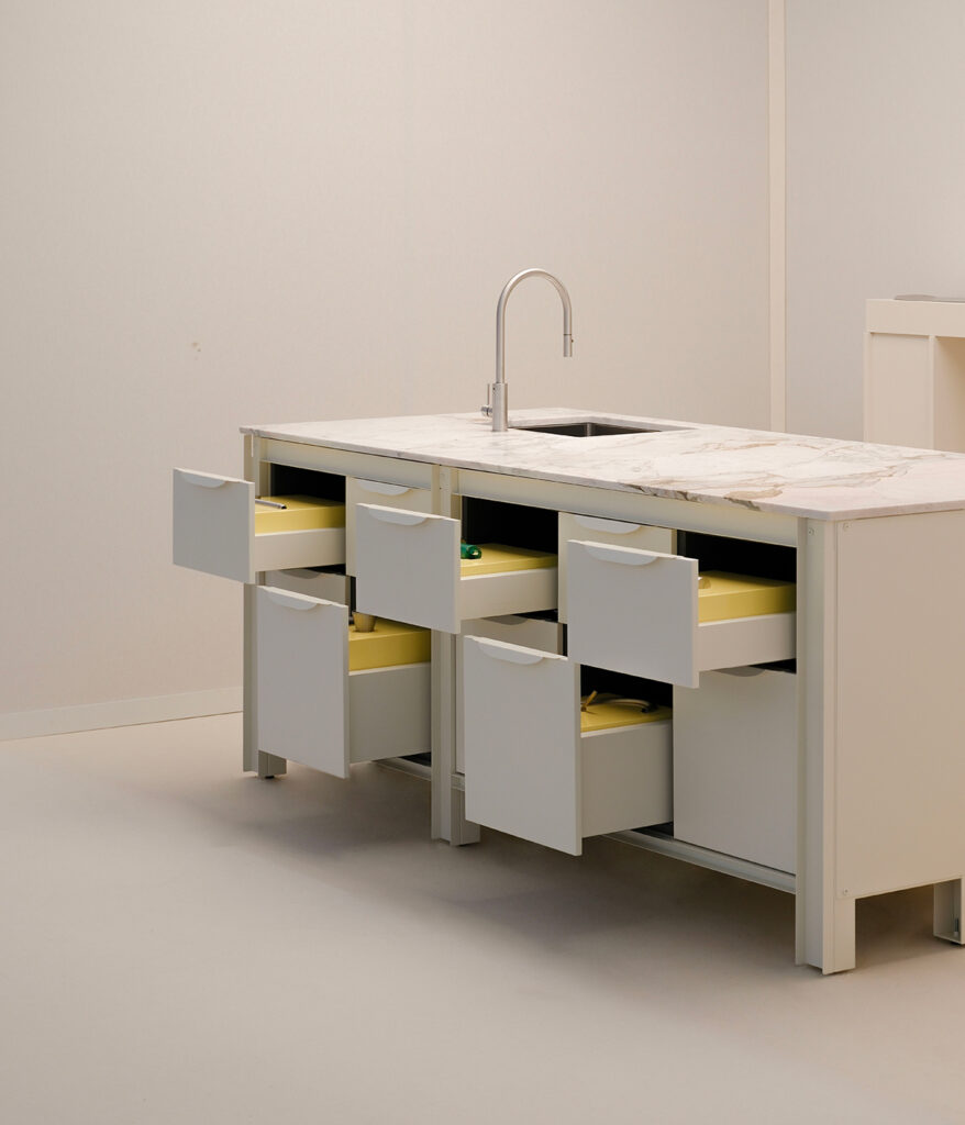 Al centro dell’installazione si trova il sistema Very Simple: Kitchen, trasformato in un’elegante scenografia che ospita dieci elementi, rubinetti e componenti tecnici selezionati dal nostro catalogo. Sottratti al loro contesto abituale, questi elementi sono presentati come manufatti preziosi — gioielli industriali che rivelano la complessità e la precisione normalmente celate all’interno dei prodotti di uso quotidiano.