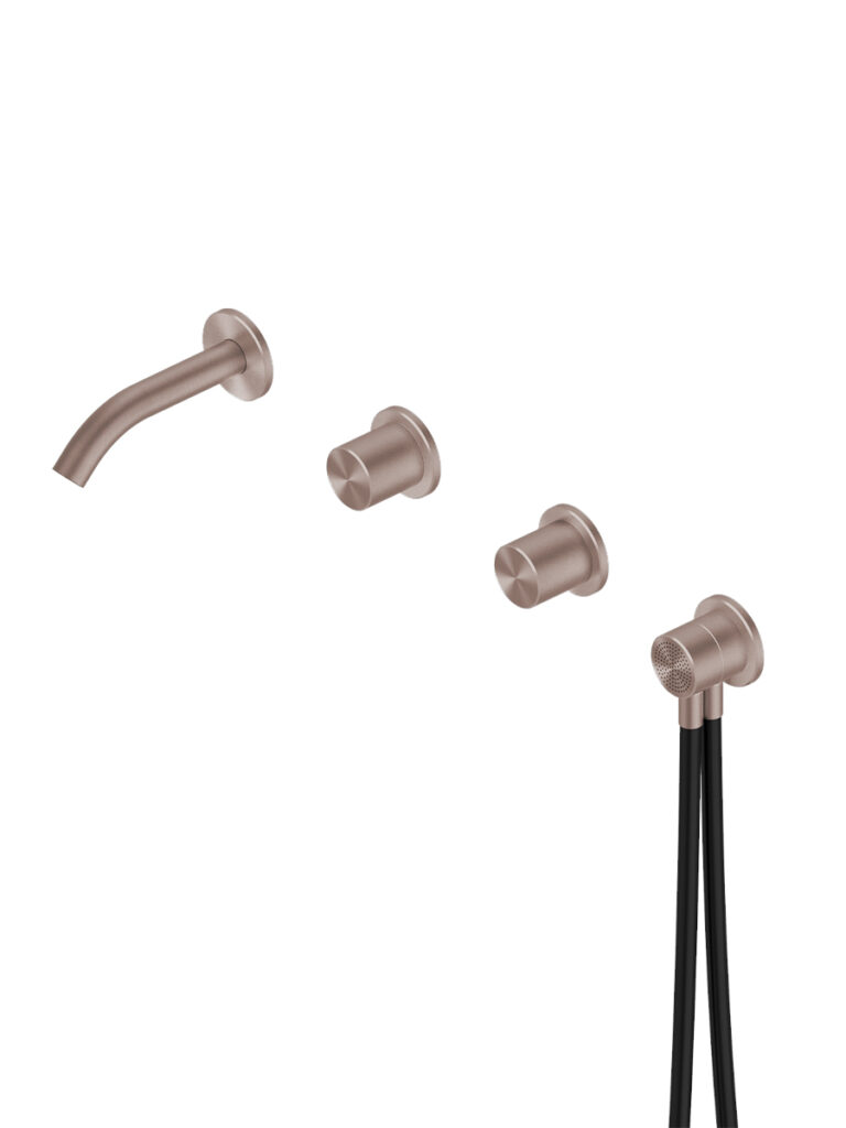 Gruppo due miscelatori progressivi a parete con bocca di erogazione e kit doccia.