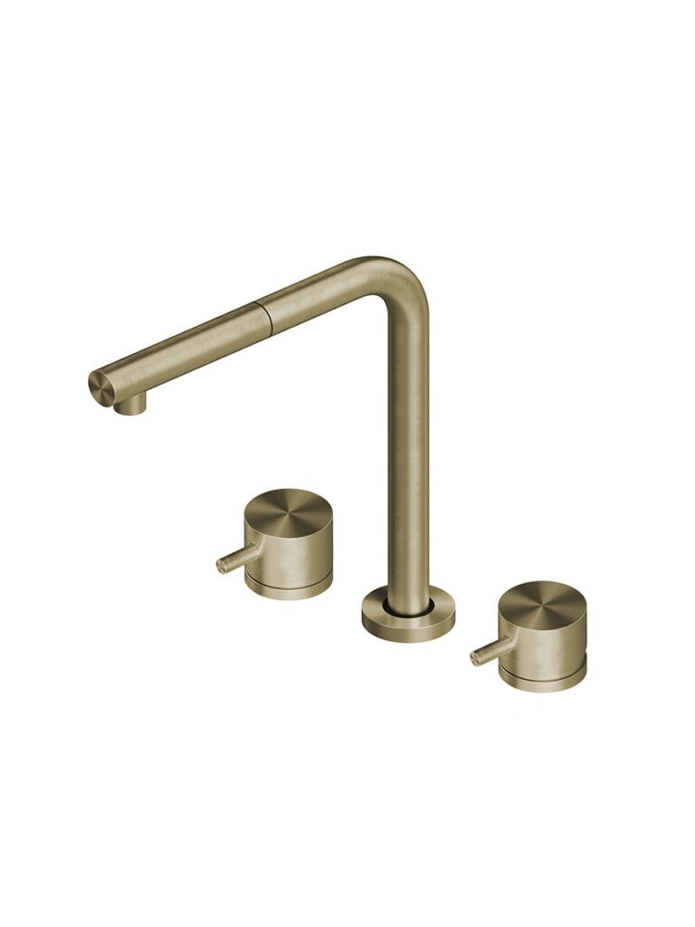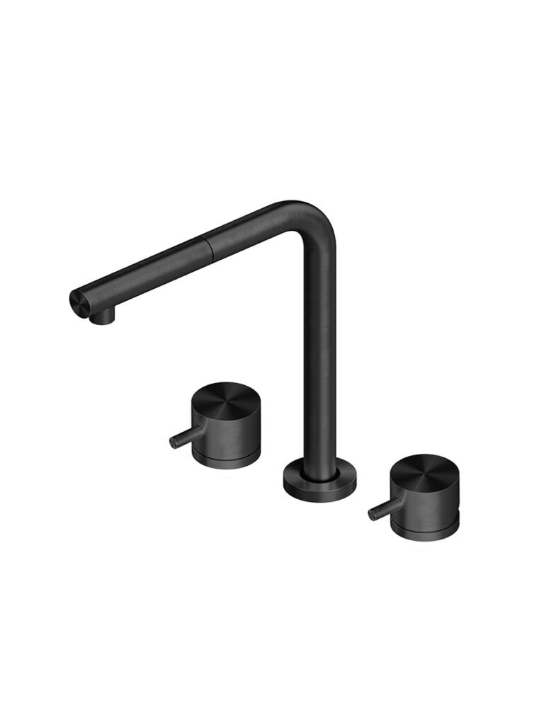 Gruppo miscelatore da piano in acciaio inossidabile AISI316L con bocca girevole a tre vie, abbattibile ed estraibile, con comando remoto per trattamento acque. Si abbatte fino a 6cm.
