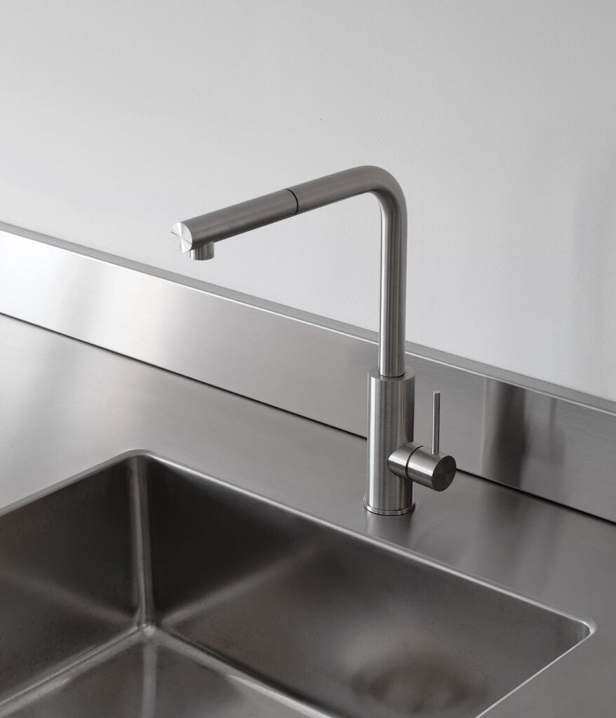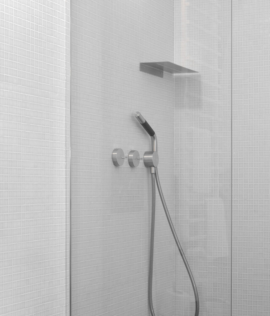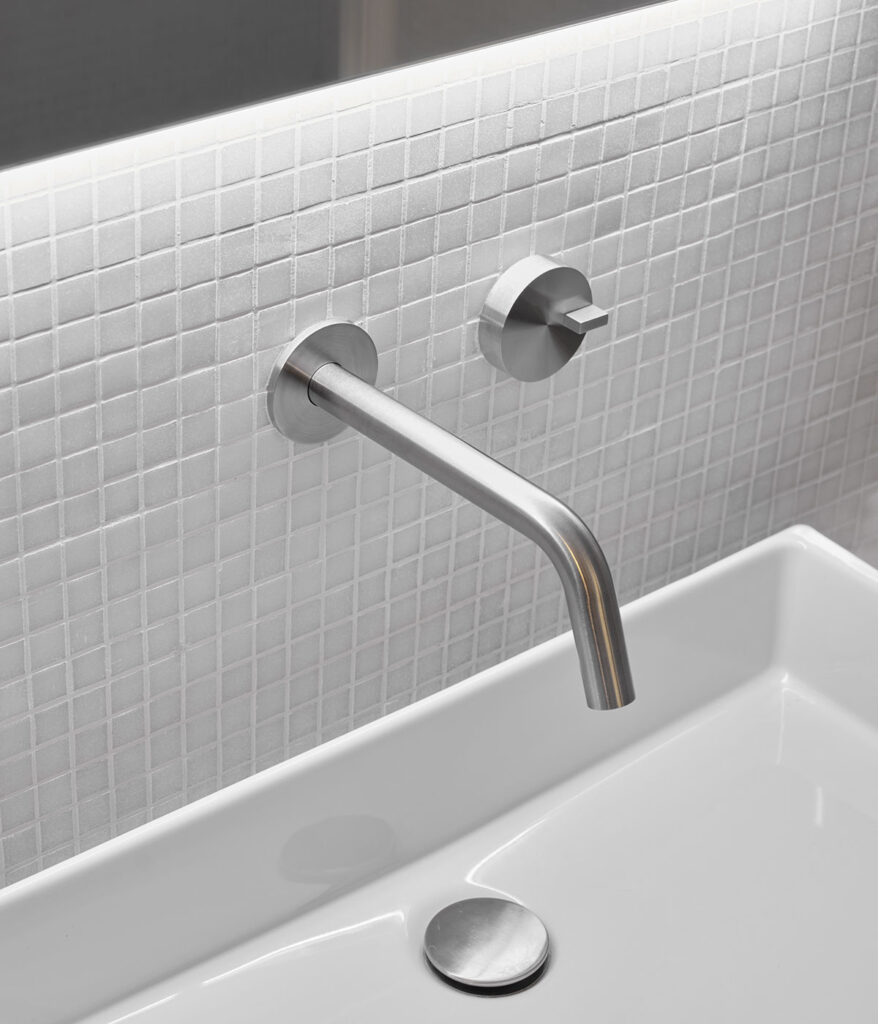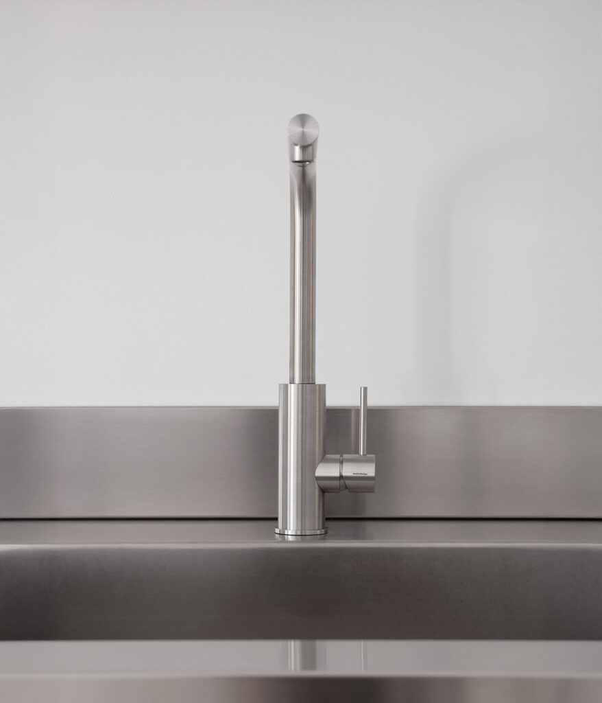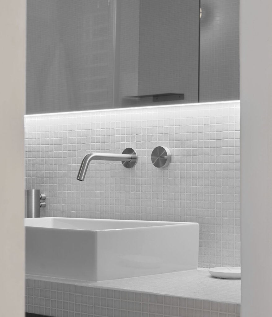 Ogni appartamento presenta una zona giorno open space, una cucina completa realizzata da Very Simple Kitchen con il miscelatore estraibile art. 669 di QuadroDesign, e arredi firmati e15, apprezzati per le forme essenziali e la lavorazione in legno massello. Il layout si completa con una camera da letto accogliente e un bagno moderno, dove sono installate le linee essenziali e architettoniche della serie Q, disegnata da Studio Adolini.