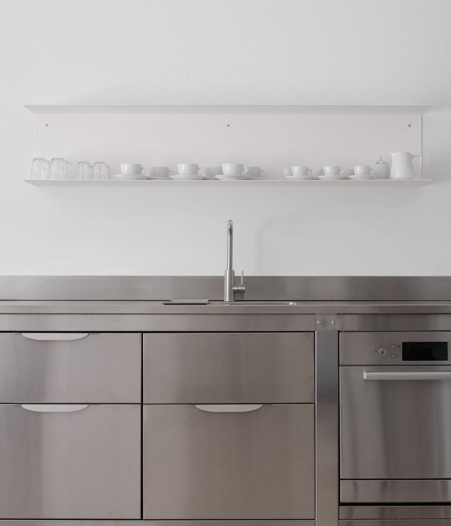 Lo studio ha combinato il design moderno dei prodotti con le texture grezze del loro posto di lavoro. Gli interni presentano dettagli interessanti, come l’angolo cottura rosa con piano di lavoro in acciaio inox e il nostro rubinetto a tre fori Valvola02, gli oggetti stampati in 3D e il tavolo da pranzo e da riunione in alluminio grezzo.