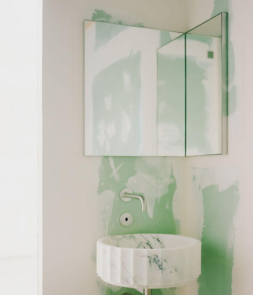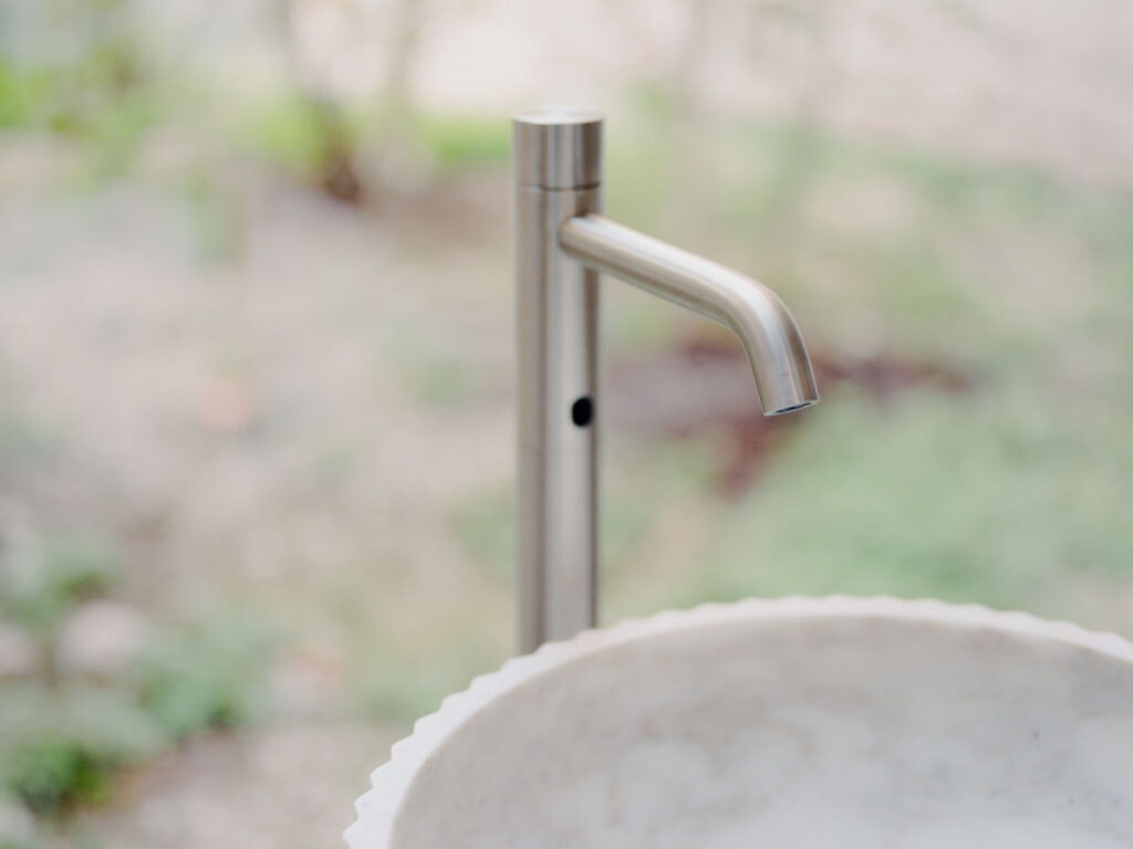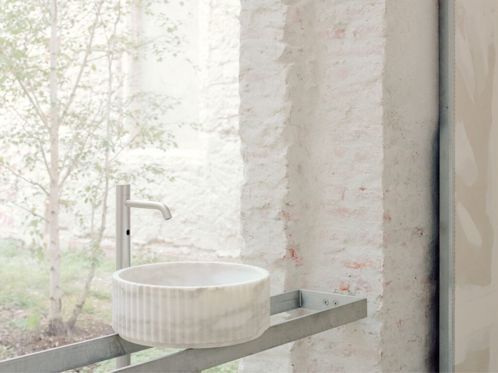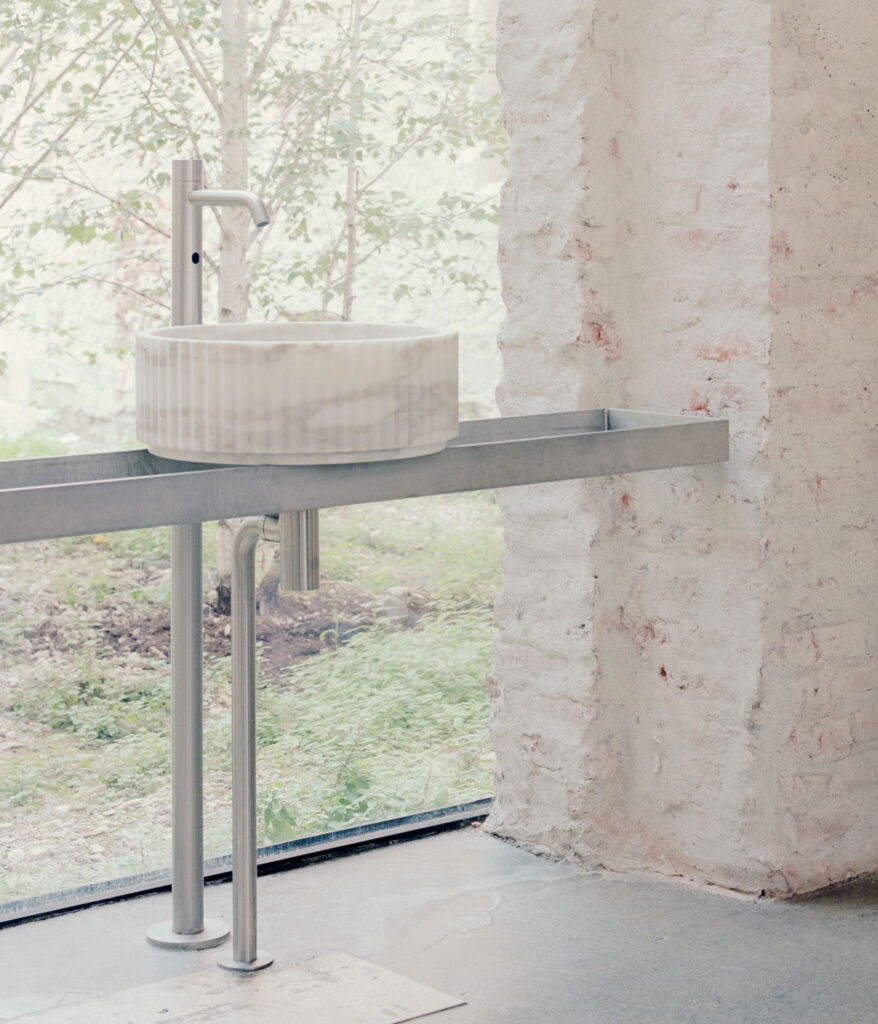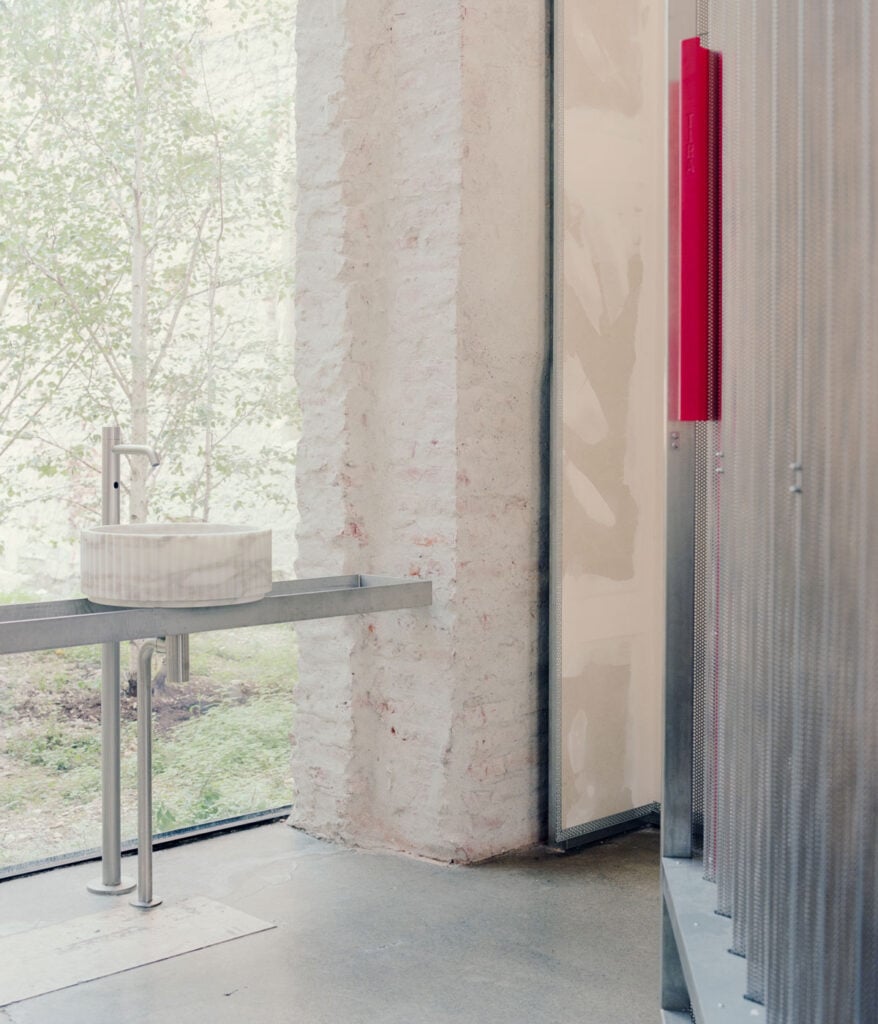 Il bagno, celato dietro al sipario di lamiera stirata in acciaio, è lo spazio in cui questa volontà di incompiutezza si rivela con maggiore intensità: qui trova posto la serie Sense, dotata di sistema a rilevazione di presenza a infrarossi. Oltre alla rubinetteria è stato studiato un sifone custom con attacco a pavimento specifico per il progetto.